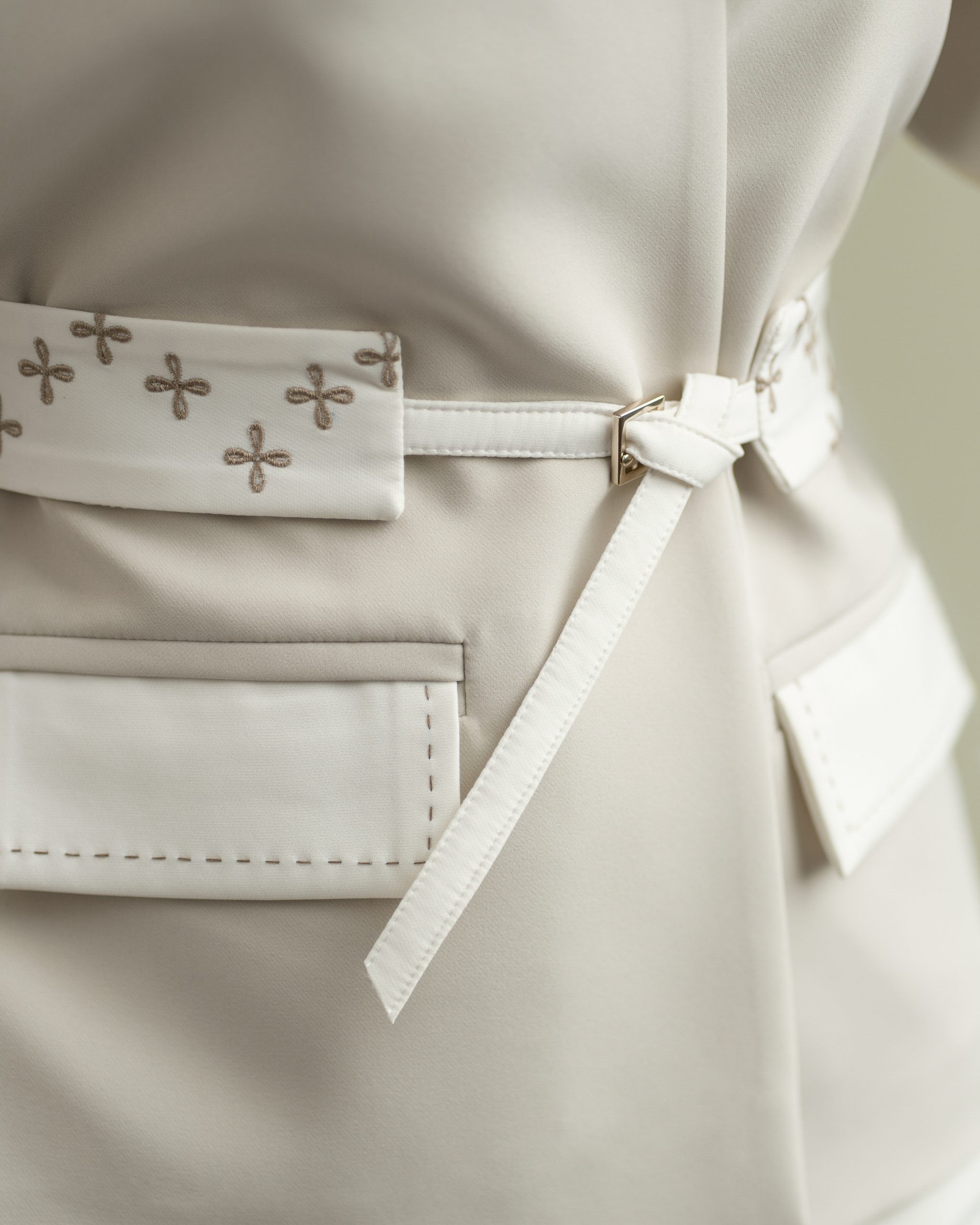 به همراه گلدوزی ها، گل چهارپر تو خالی روی کمربند