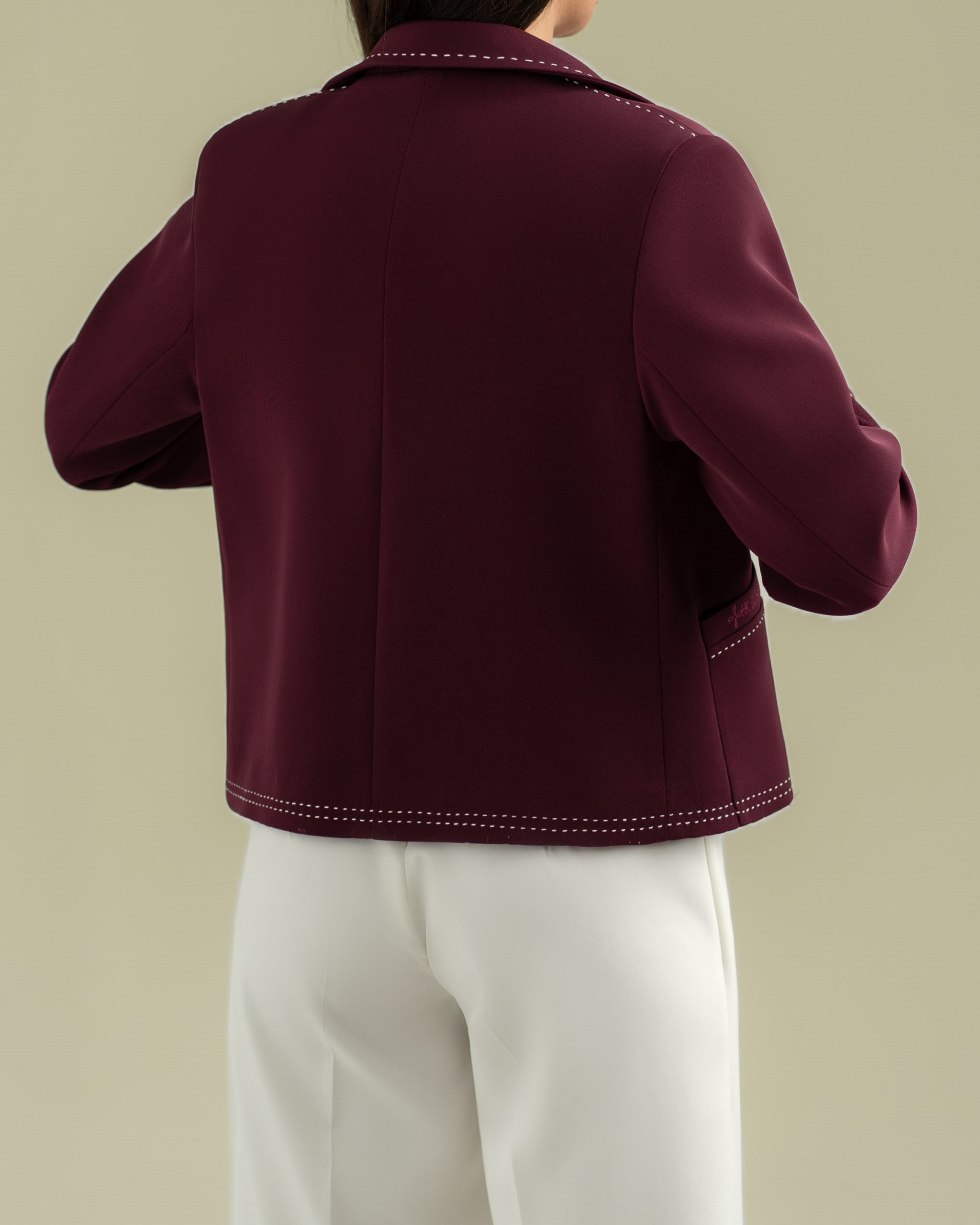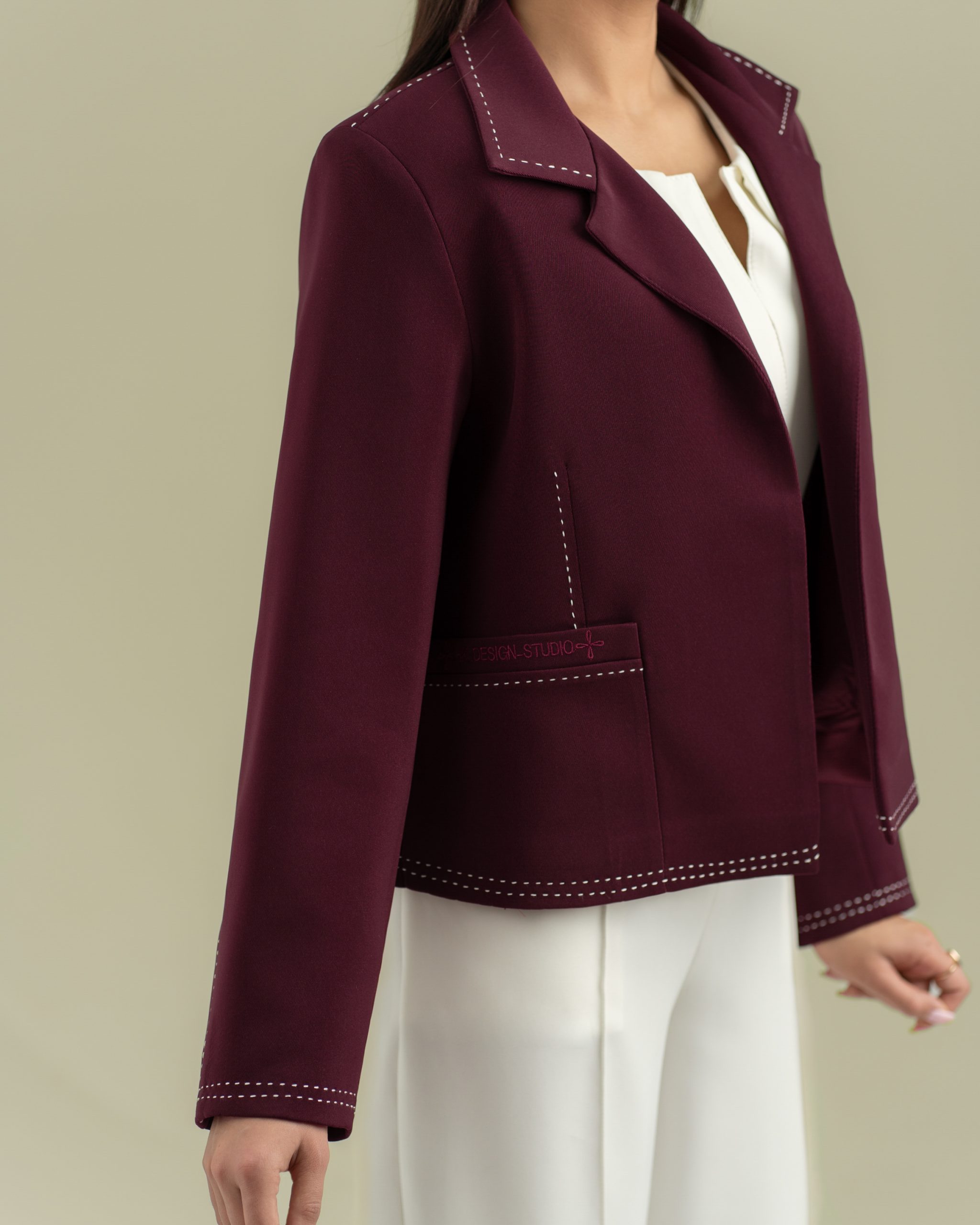 طراحی شده با فرم کنترل شده،شلال دوزی در ردیف پائین،لبه استین و سرشانه،یقه شکاری و گلدوزی روی سرجیب