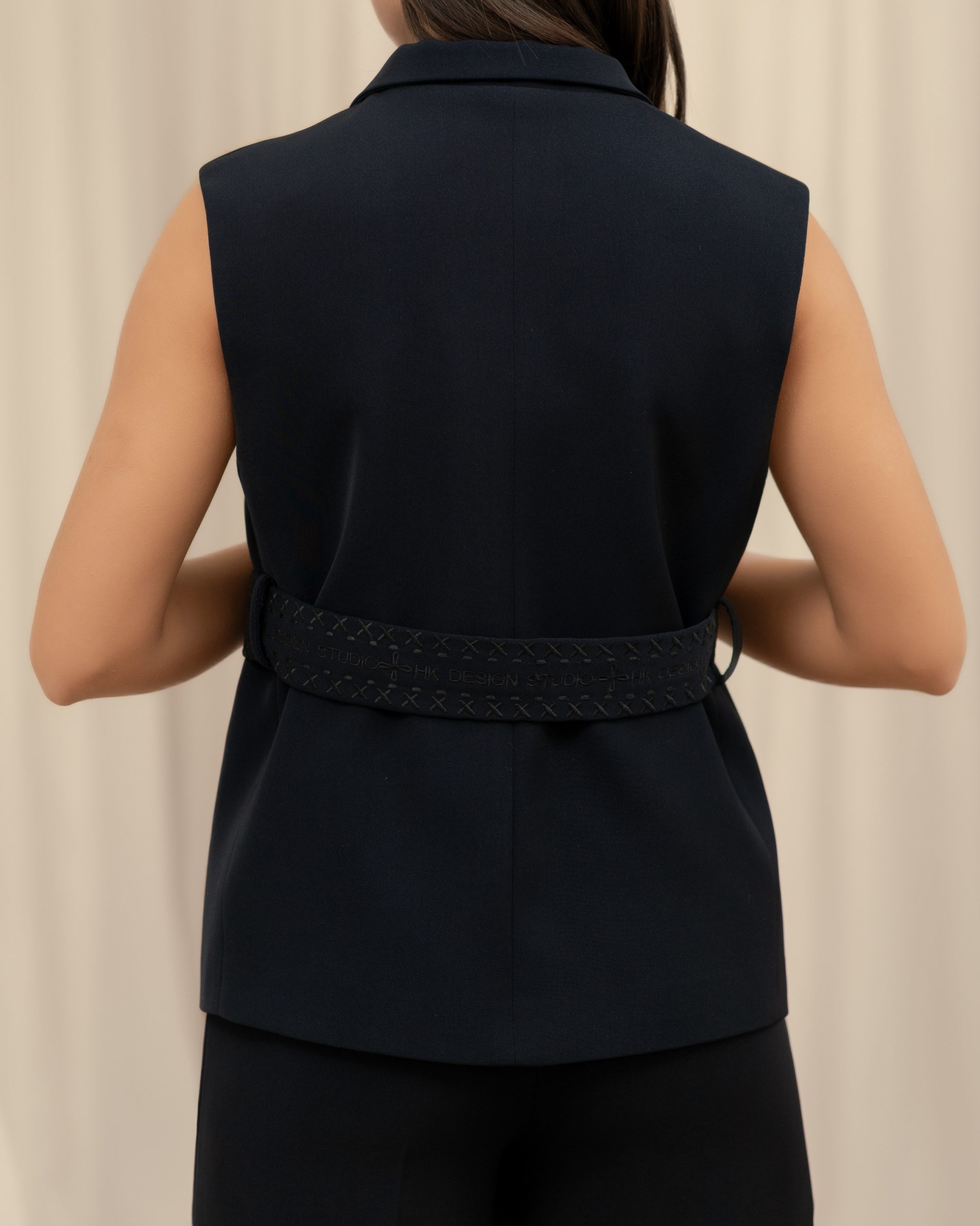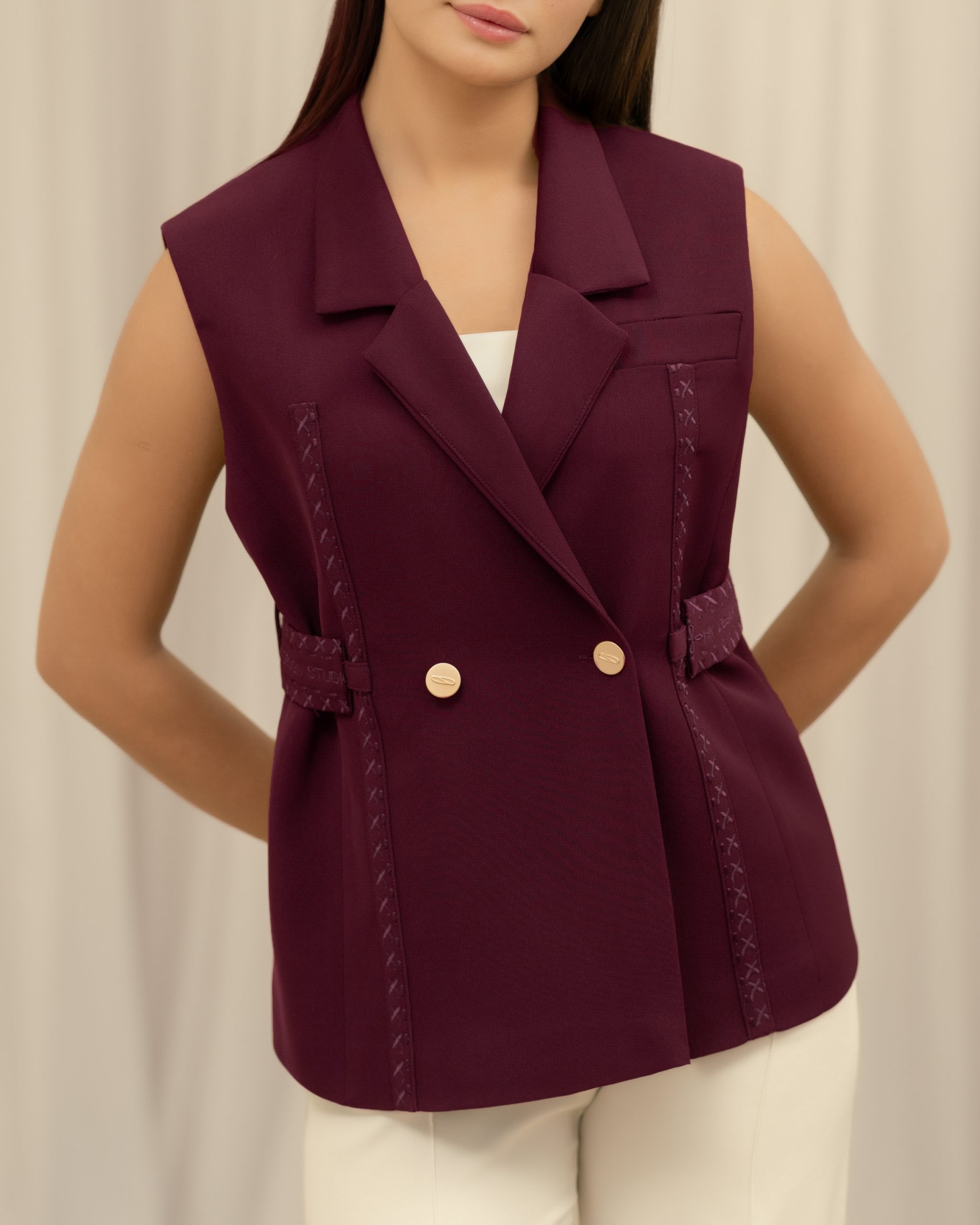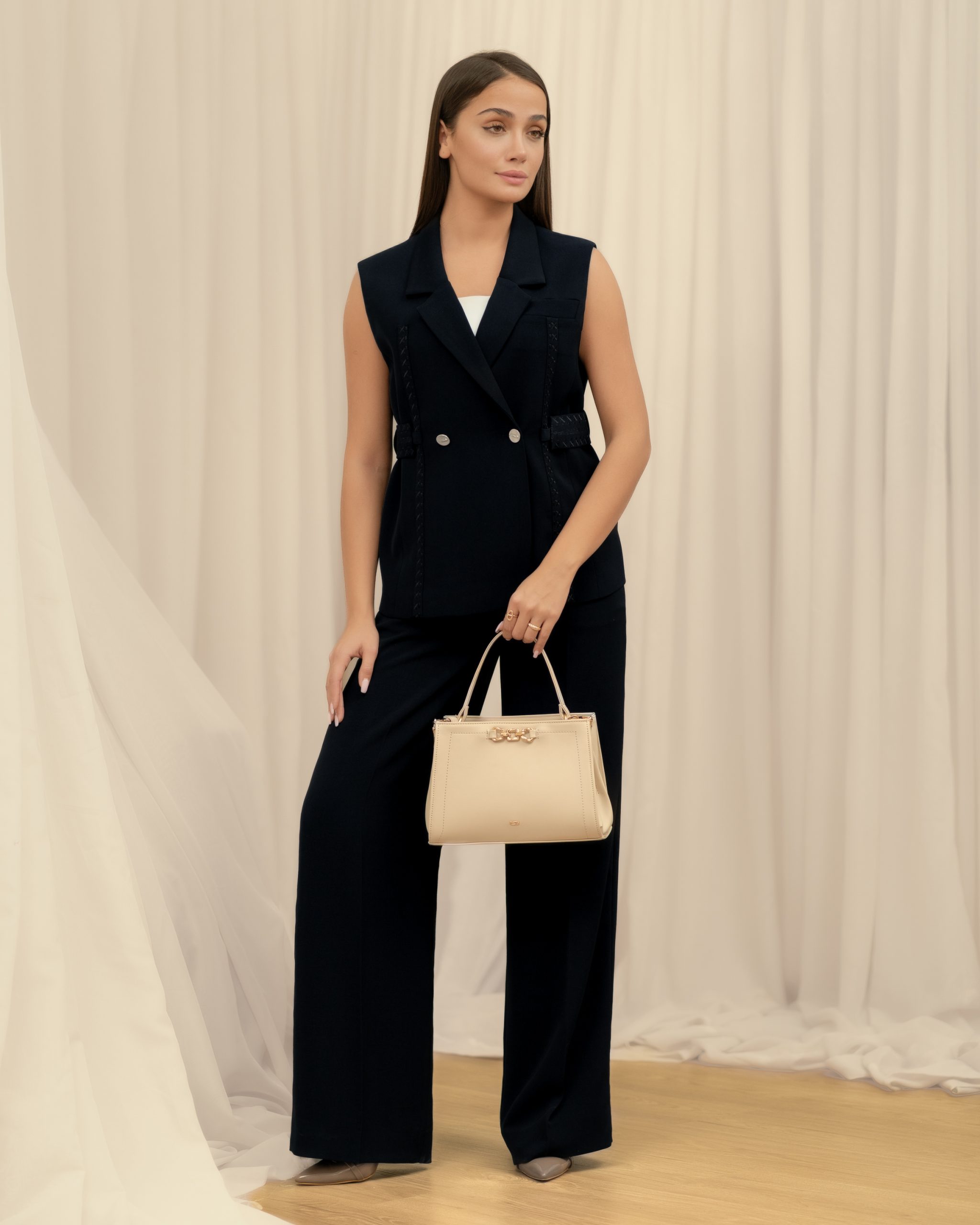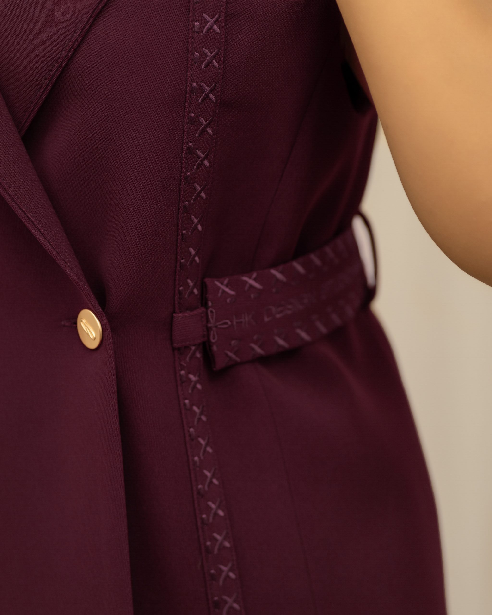 وست زنانه طراحی شده با پارچه کرپ کنزو،نرم به همراه 2 نوار گلدوزی باریک در جلوی لباس و گلدوزی روی کمربند
