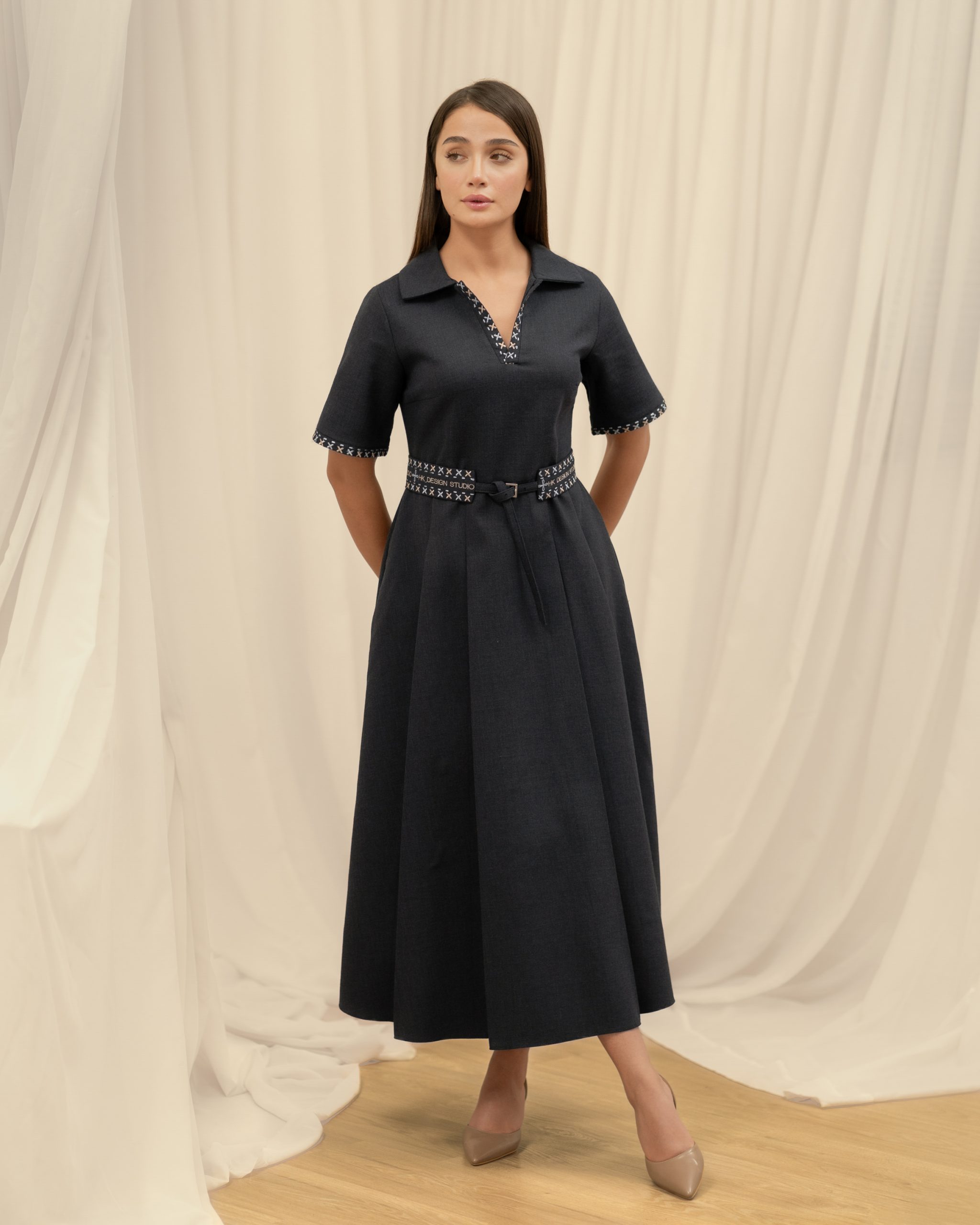 یقه شکاری و گلدوزی در سجاف و لبه آستین کوتاه،
